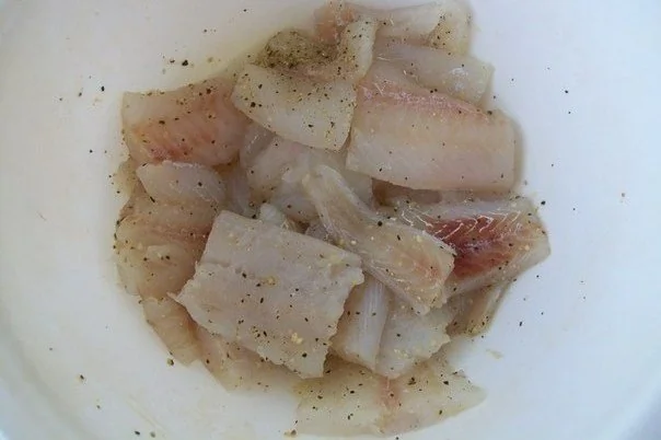 ШАГ 1 Рыбу нарезать на кусочки, посыпать специями ( я использую приправу «Лимонный перец») и оставить на 30 минут.