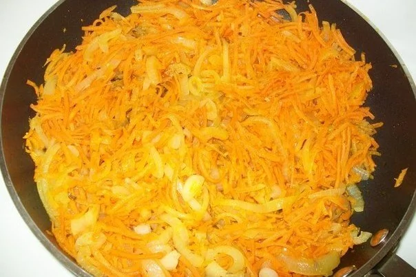 ШАГ 2 В это время порезать лук полукольцами и натереть морковь на крупной терке, обжарить в растительном масле, добавив специи.