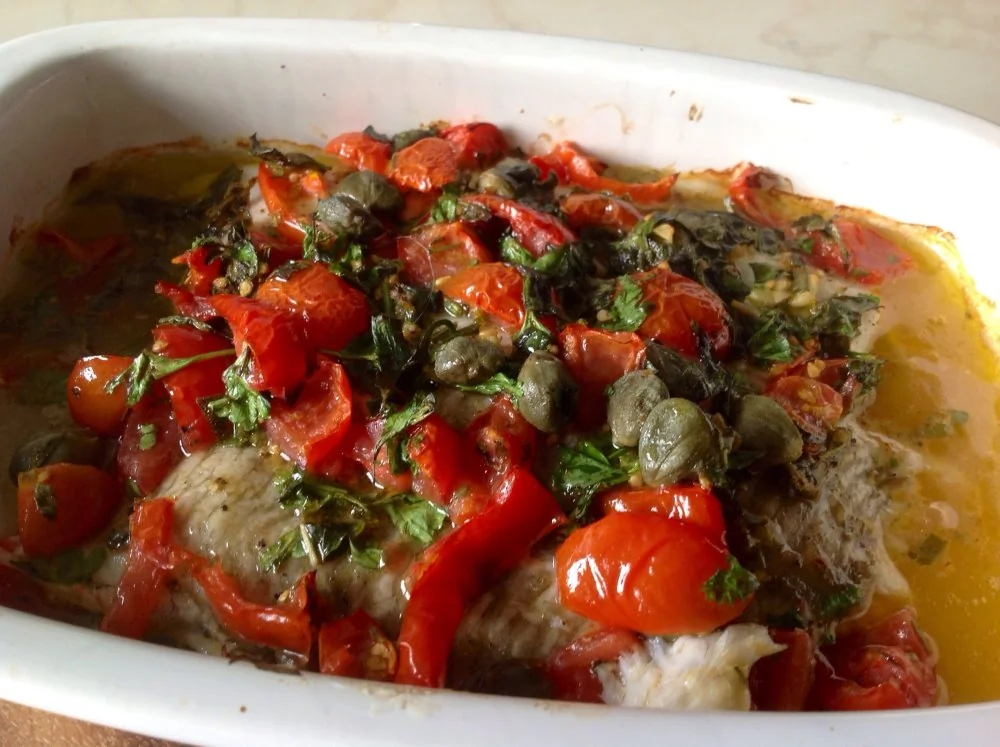 Камбала, запеченная с помидорами