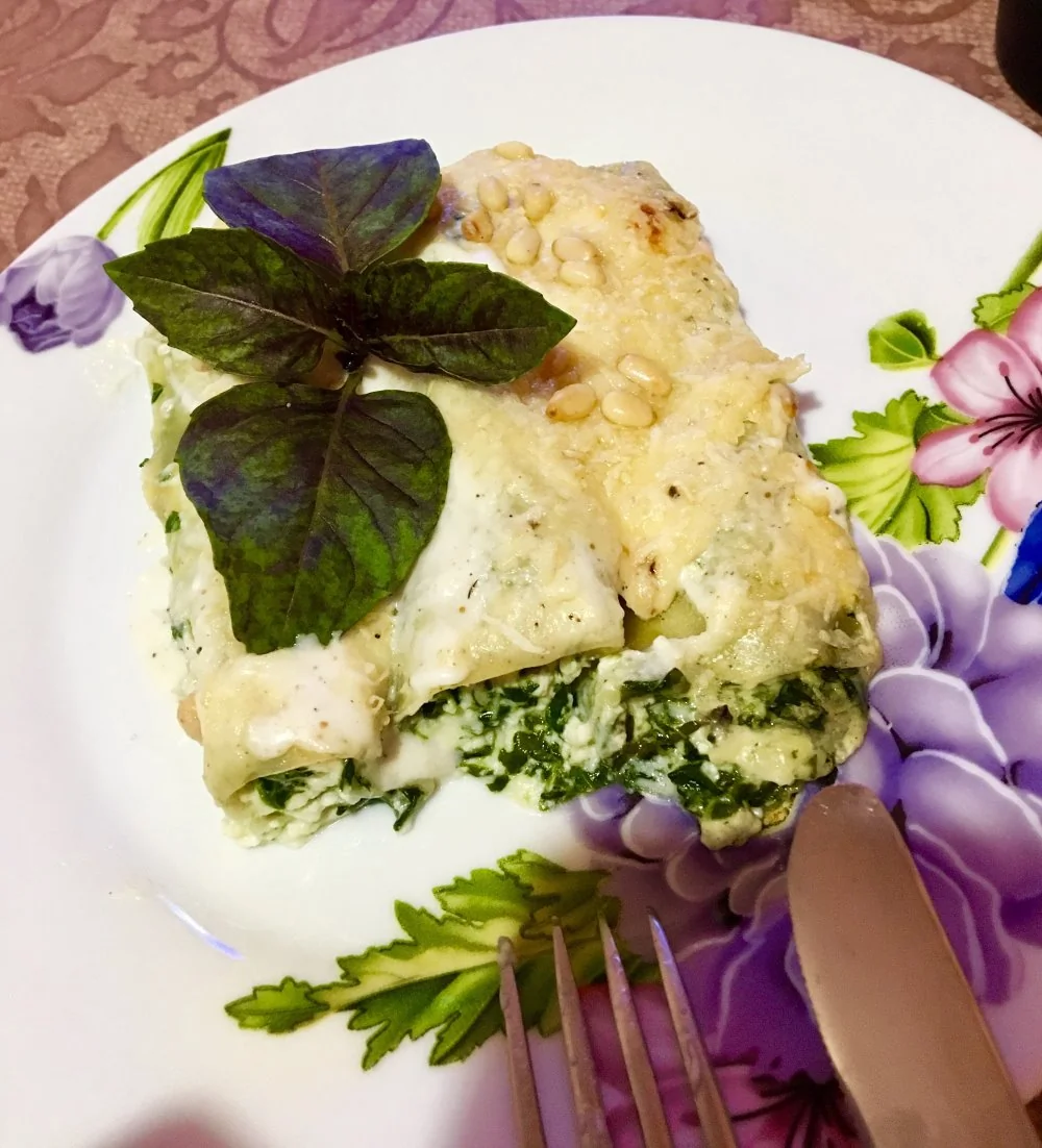 Каннеллони со шпинатом и сыром под соусом бешамель