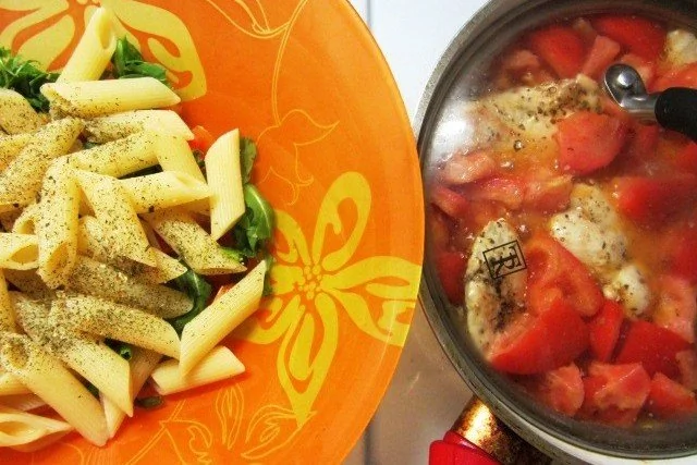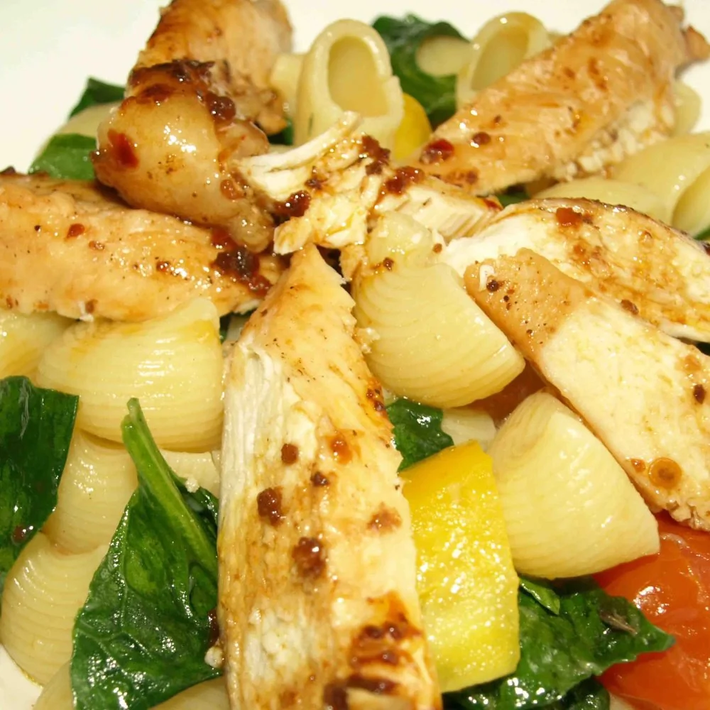 Ингредиенты для приготовления Теплый салат из пасты, курицы и шпината: