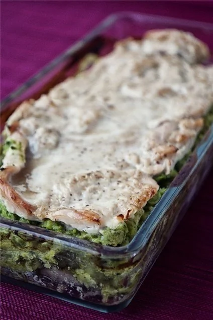 ШАГ 3 Откладываем немного соуса для обмазки второй половины индейки, остальное добавляем в брокколи, перемешиваем, выкладываем сверху индейки и покрываем оставшимся мясом, предварительно его обмазав. Верхний слой лучше дополнительно покрыть йогуртовой смесью.