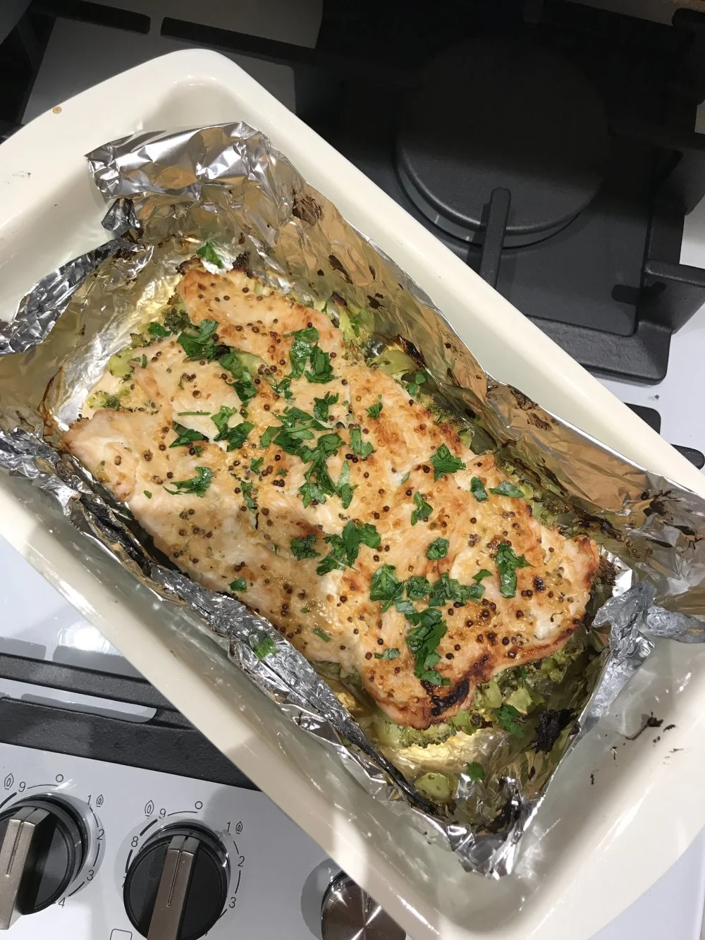ШАГ 2 Брокколи отвариваем, пюрируем. Йогурт смешиваем с соевым соусом и горчицей. Половину «стейков» обмазываем соусом, выкладываем в форму для запекания. слой не должен быть толстым.