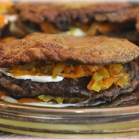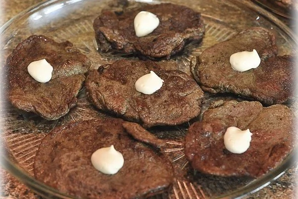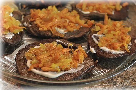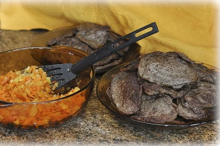 ШАГ 1 Печень очищаем от пленок и жилок, перемалываем в мясорубке или блендере. Добавляем яйца, молоко, соль и перец. Жарим печеночные оладушки. Далее обжариваем лук и морковь. Не солим и не перчим.