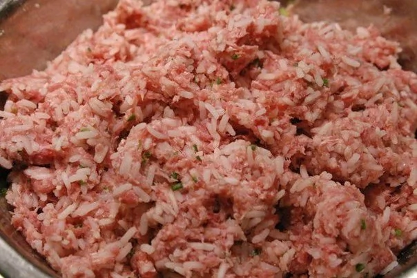 ШАГ 2 Смешайте фарш, рис, нарезанный лук, посолите.