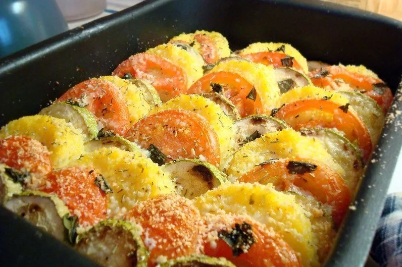 Овощи, запеченные с полентой