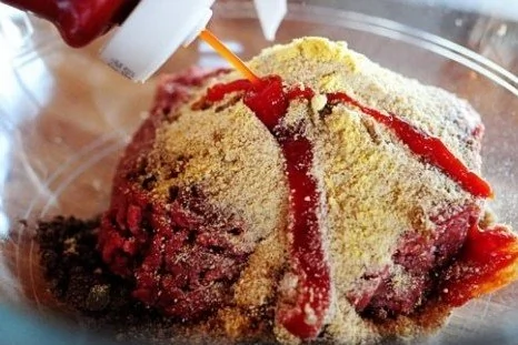 ШАГ 2 В большой миске смешиваем фарш, сухую горчицу, хлебные крошки, соль, перец, измельченный в крошку кубик говяжьего бульона, половину кетчупа.