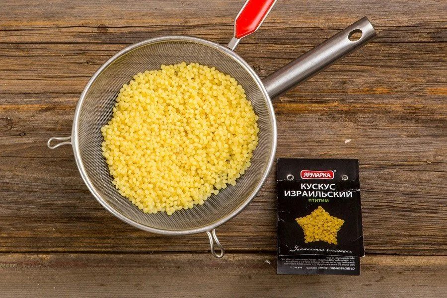 ШАГ 1 Отварите птитим в кипящей подсоленой воде с небольшим количеством оливкового масла в течение 15 минут, слейте воду.