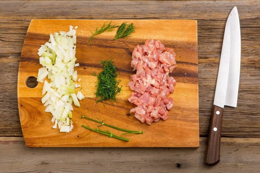 ШАГ 3 Очистите и нарежьте лук мелко, нарежьте курицу небольшими кусочками, укроп без стеблей мелко (отложите 2 макушки укропа на украшение).