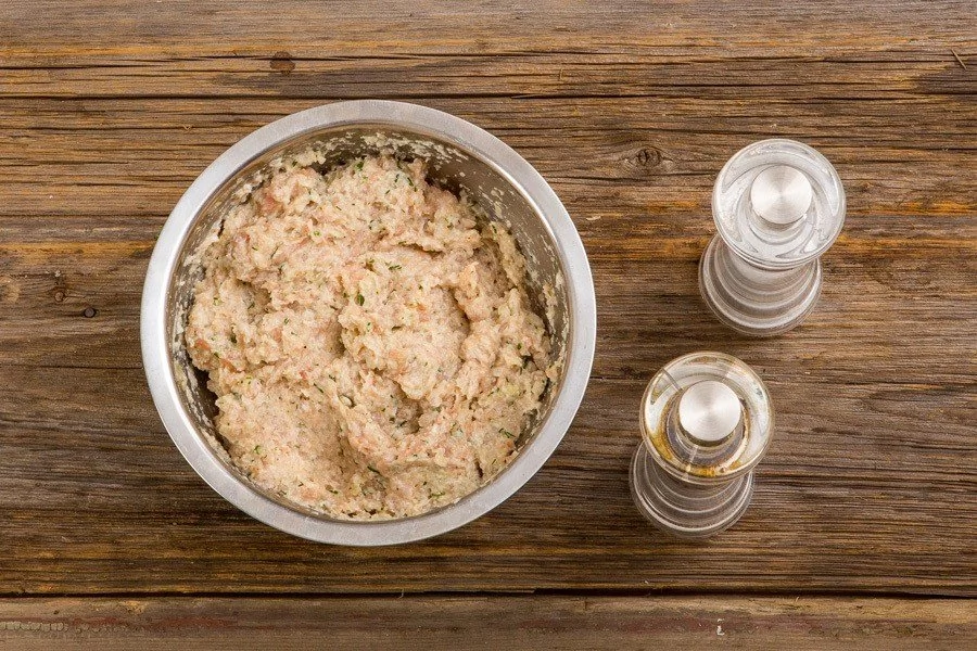 ШАГ 4 Отожмите хлеб; пропустите хлеб, мясо, лук и укроп через мясорубку, посолите, поперчите, тщательно перемешайте.