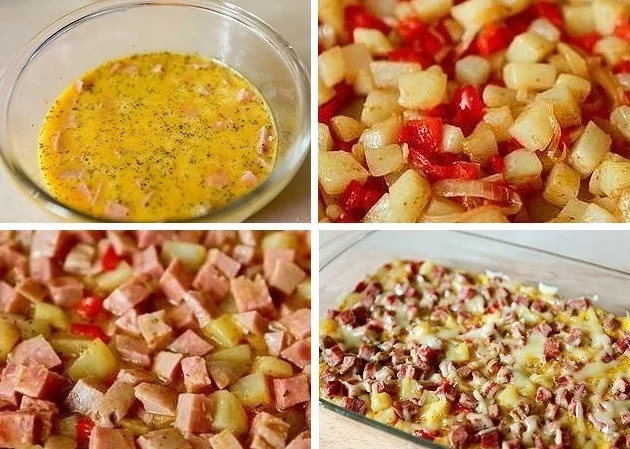 ШАГ 6 Взбить яйца, добавить к ним ветчину.