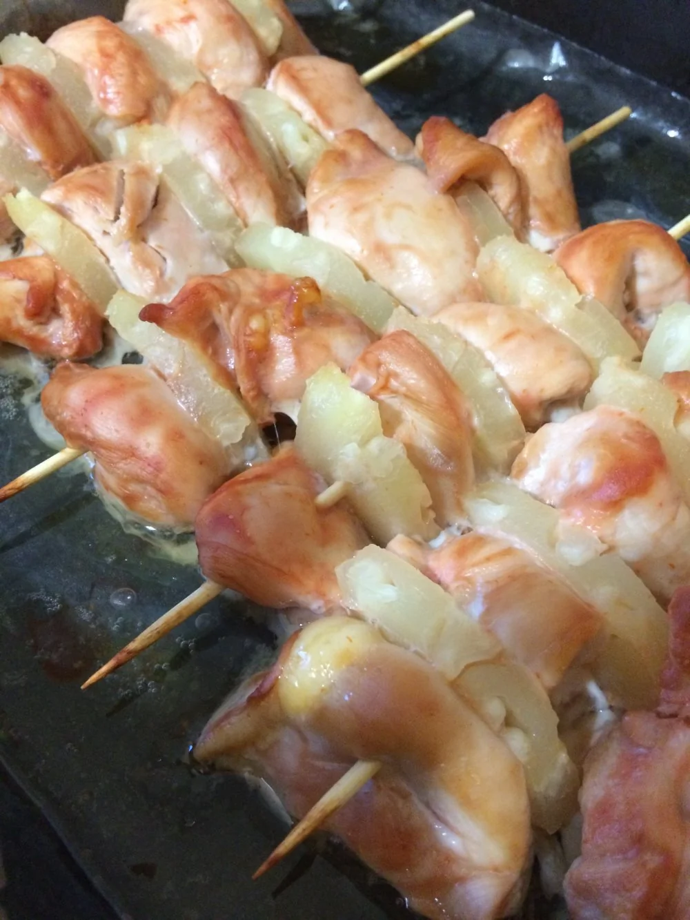 ШАГ 3 Насаживаем на шпажки филе и ананасы, чередуя их между собой. Застилаем противень бумагой для запекания. Выкладываем на нее шпажки с шашлычком. Ставим форму в духовку и запекаем ее в течение сорока минут.