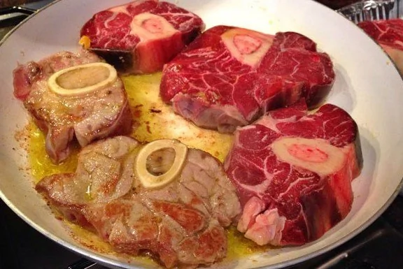 ШАГ 1 Мясо — распиленная на «шайбы» говяжья голяшка: вокруг мякоть, а посередке — мозговая косточка. Мясо посолить, поперчить. Мясо обжарить на сковороде с 2 сторон на смеси сливочного и оливкового масла.
