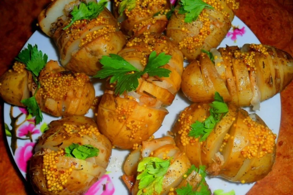 ШАГ 1 Сделать в картошке поперечные надрезы, но не дорезая до конца. Это удобно делать на тарелке с бортиками, которые не дадут ножу опустится до самого низа.