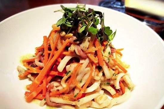 ШАГ 2 Морковь натираем на терке соломкой, солим, даем постоять и отжимаем образовавшийся сок. Кальмара режем соломкой.