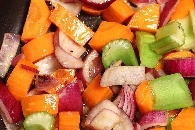 ШАГ 2 Убавьте огонь до среднего, добавьте в кастрюлю еще немного масла. Добавьте крупно нарезанные лук, морковь и сельдерей, и наслаждайтесь зрелищем.