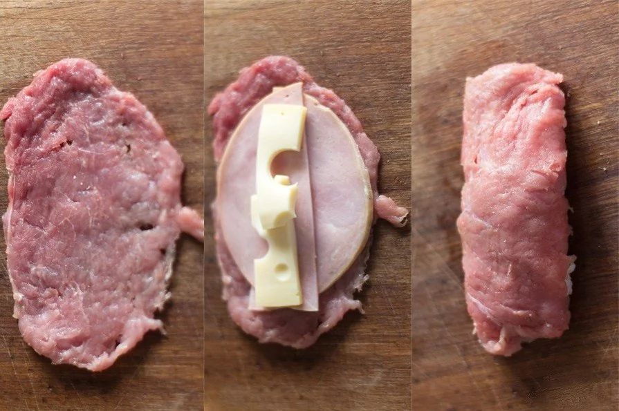 ШАГ 3 Постелите на мясо ветчину, сверху положите сыр. Затем, сверните все в рулет, Мясо должно прекрасно склеиться, будьте отважны.