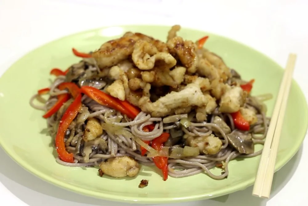 ШАГ 1 Тонко режем грудку и добавляем в неё три столовых ложки соевого соуса, мед. Перемешиваем и даем час промариноваться. Для остроты можно добавить чеснок. Соль, перец по вкусу.