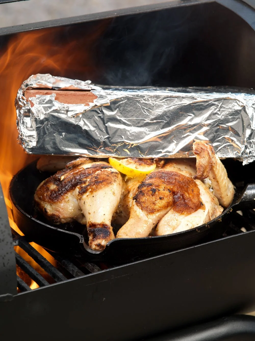 ШАГ 5 Тяжелый кирпич обернуть фольгой и тоже хорошо раскалить на решетке гриля. Положить цыпленка грудкой вниз на сковородку и хорошо придавить сверху кирпичом.