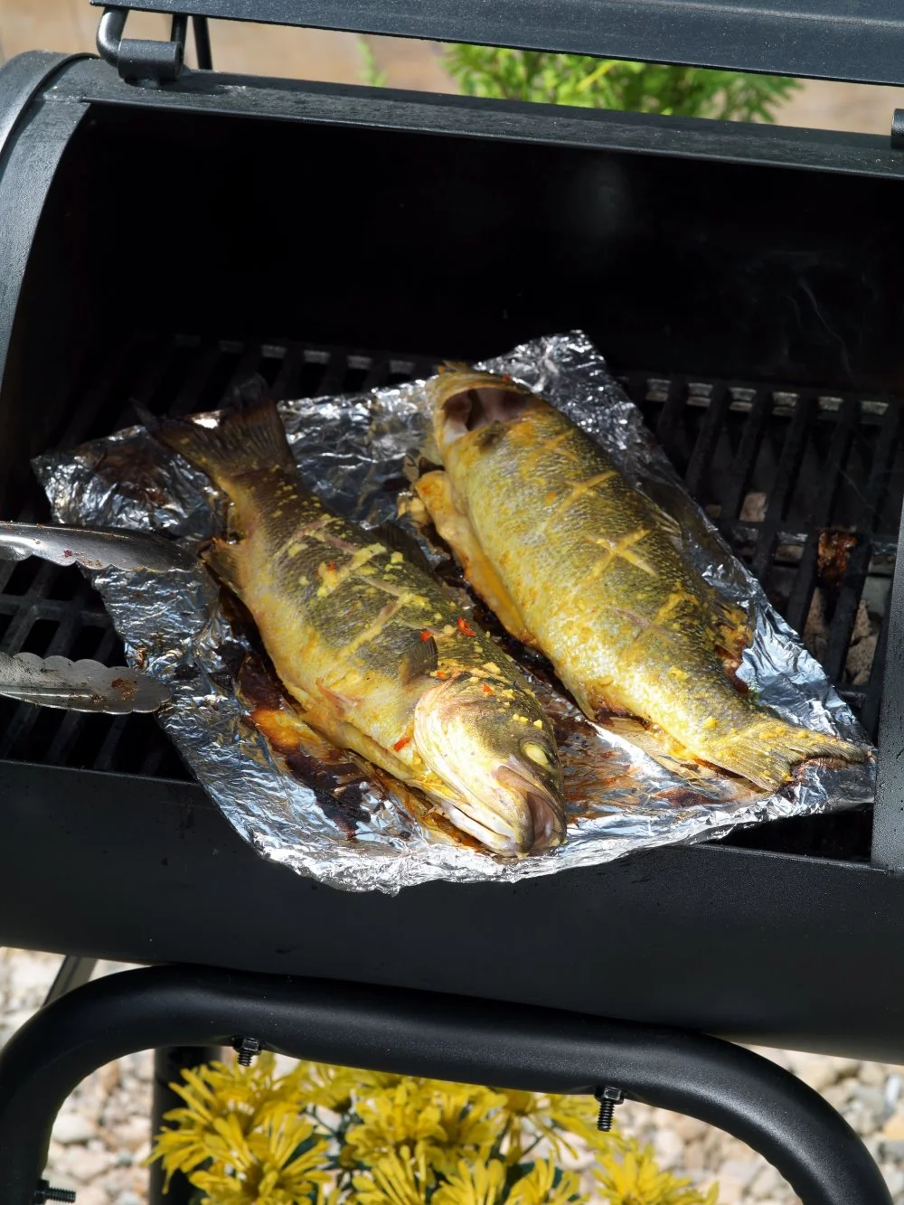 ШАГ 4 Разогреть гриль. Покрыть решетку гриля листом фольги, слегка спрыснуть его растительным маслом и сверху выложить окуня. Смазать его маринадом из кокосового молока и тамаринда (для этого удобно использовать кулинарную кисть) и жарить, постоянно переворачивая и обмазывая маринадом с обеих сторон, в течение пятнадцати-двадцати минут до появления красивой яркой корочки.