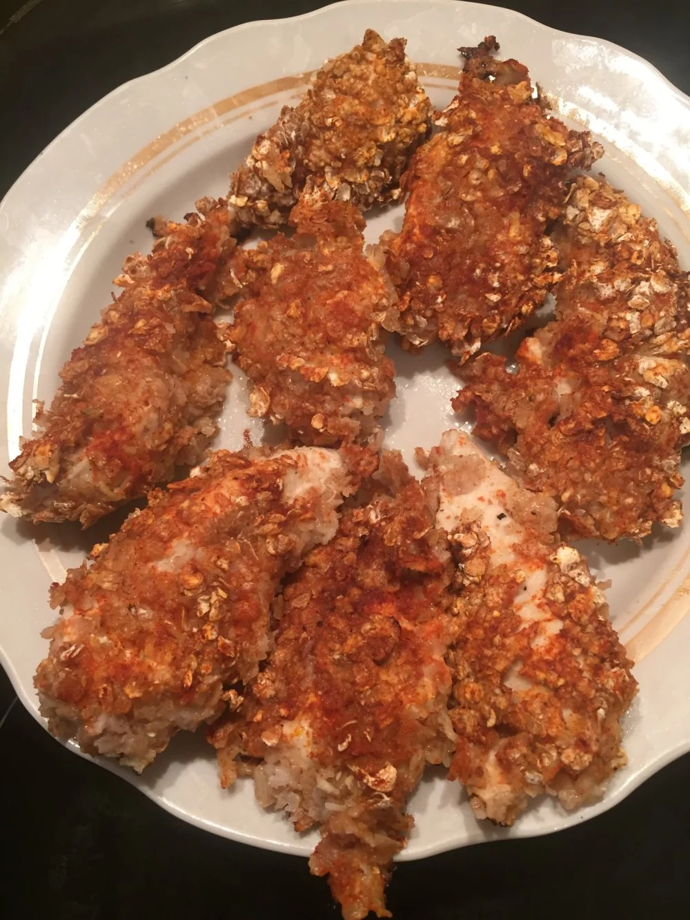ШАГ 4 Обваливаем грудки в получившейся овсяной панировке и отправляем в заранее разогретую духовку, на противне или в посуде, печем 20 минут при температуре 180 градусов.