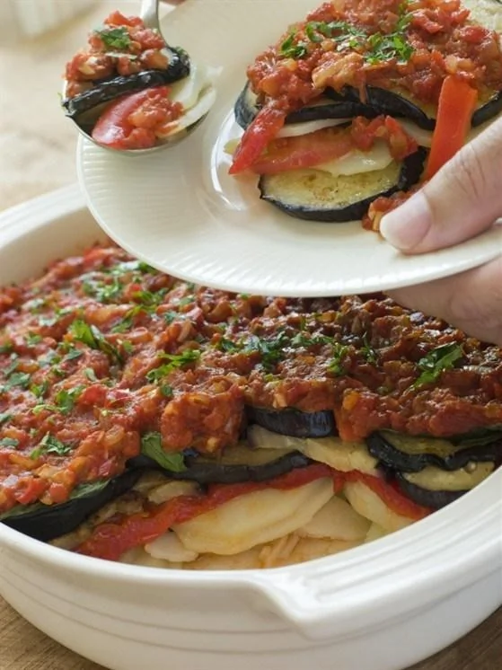 ШАГ 1 Баклажаны, картофель, помидоры нарезать кружочками. Баклажаны посолить и обжарить на растительном масле с двух сторон, картофель поварить в течение 3 минут в подсоленной воде.