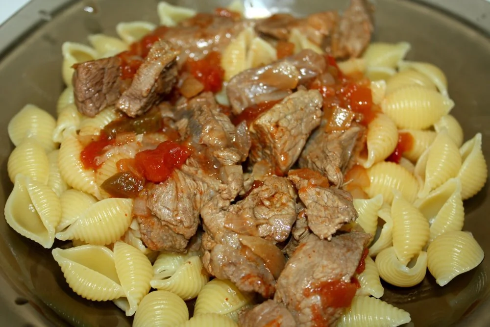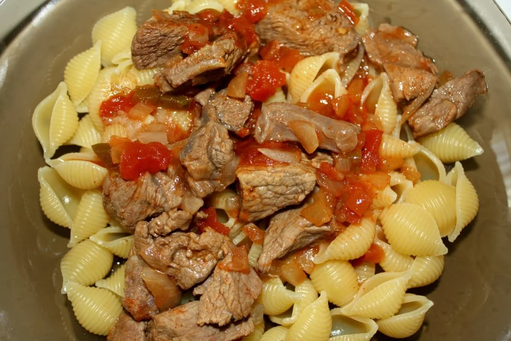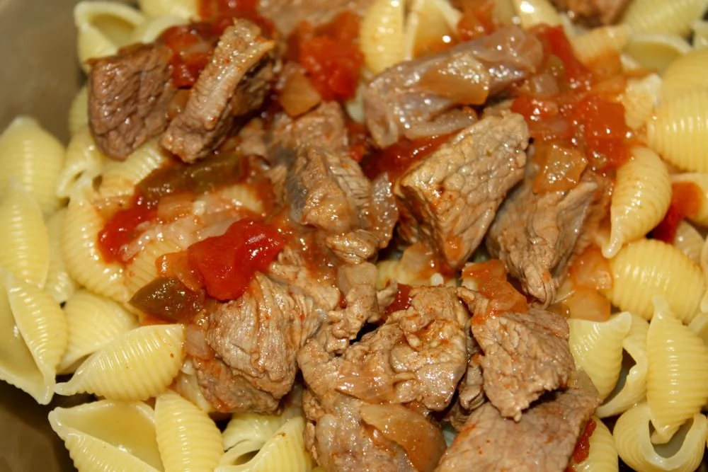 ШАГ 10 Переливаем содержимое сотейника к мясу, добавляем размятые томаты вместе с соком, кладем нарубленные перчики. Солим по вкусу.