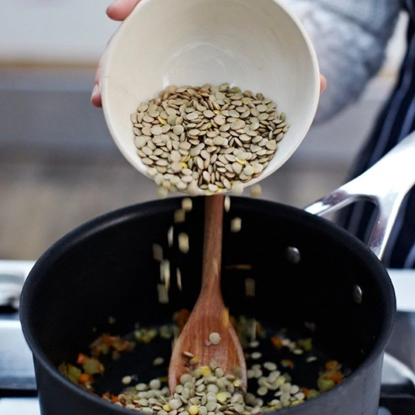 ШАГ 4 Всыпьте чечевицу и добавьте 1000 мл воды, уменьшите огонь и доведите до кипения.