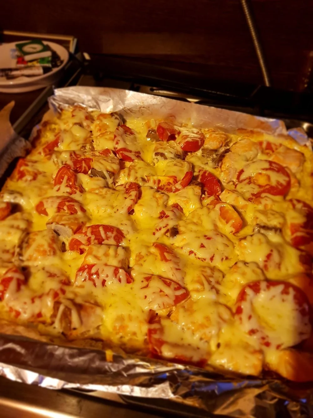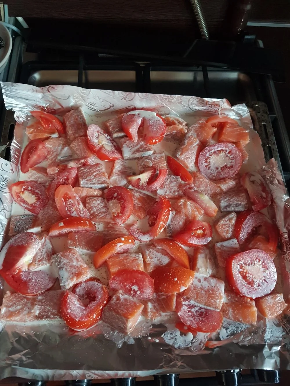 ШАГ 2 Между кусочками форели разложить помидоры, предварительно нарезанные кольцами.