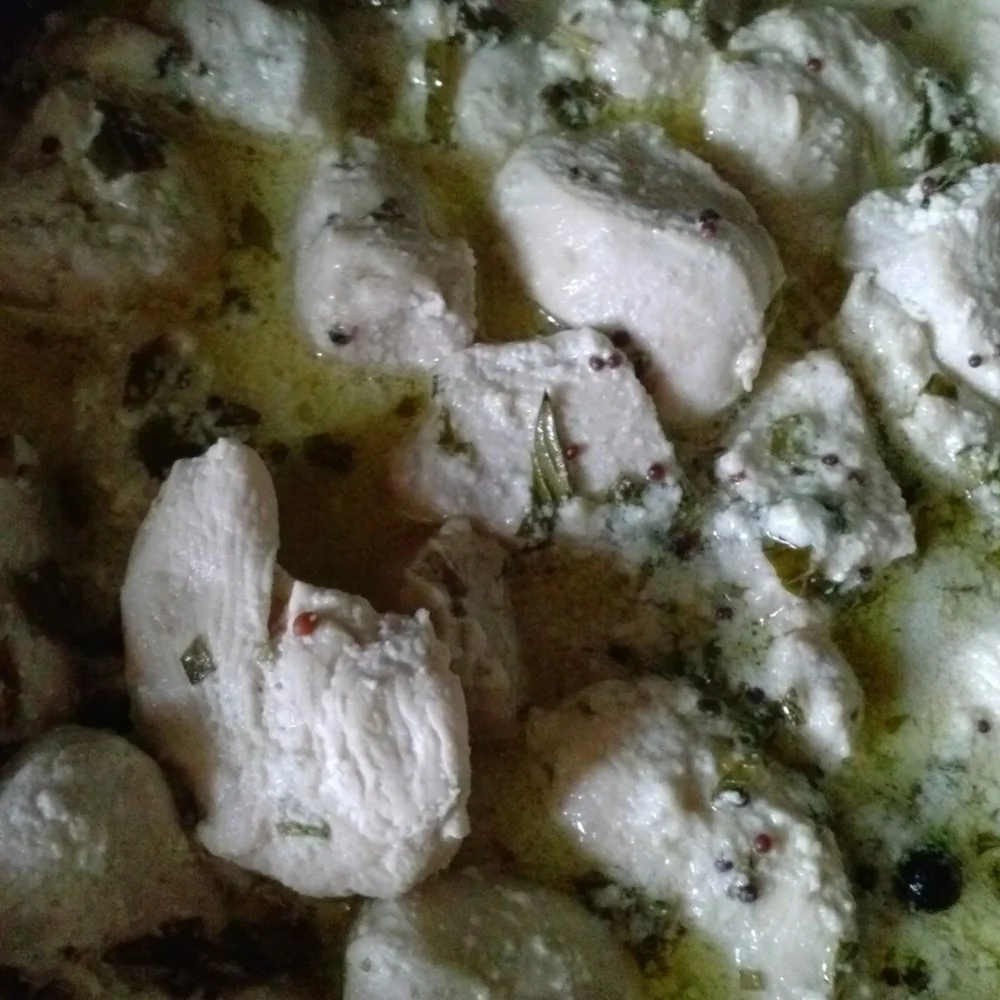ШАГ 3 Залить сливками, добавить специи (кроме мяты), соль. Тушить на медленном огне около 10 минут.