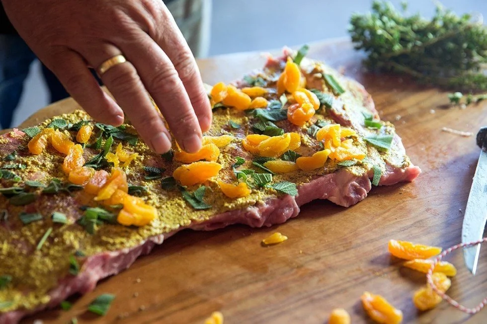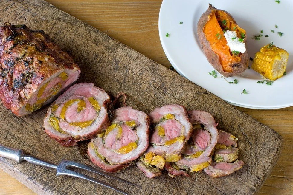 Рулет из свиной вырезки с абрикосами на гриле