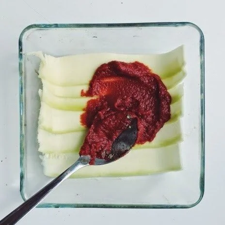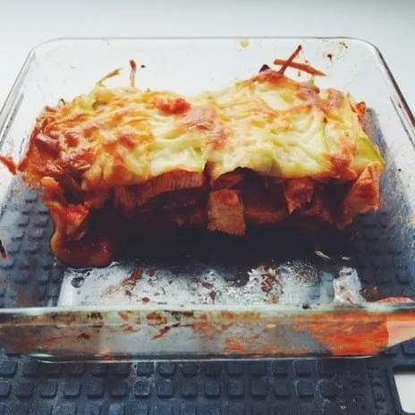 ШАГ 3 Выстилаем форму слоем кабачковых полосок, промазываем соусом и выкладываем начинку (я приготовила курочку в пароварке и выкладывала уже готовую. Если ваша начинка из овощей, мелко порубите их и добавьте) и снова выкладываем слой кабачков, соуса, начинки, кабачков, соуса.