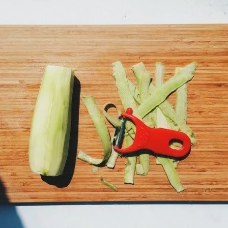 ШАГ 1 Чистим кабачок. а потом подобным образом, словно продолжая чистить, «нарезаем» его на тонкие длинные полосы