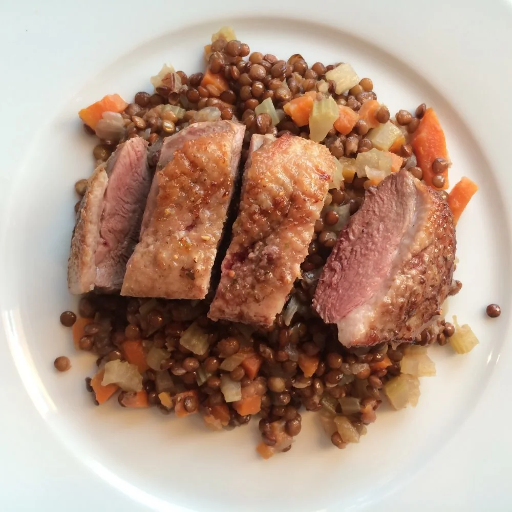 Утиная грудка с чечевицей и соусом из ревеня