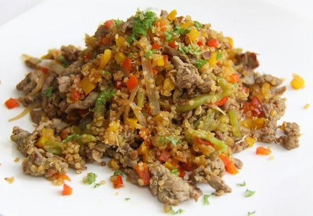 ШАГ 8 Добавляем готовый киноа и все тщательно перемешиваем. Выкладываем на тарелку и украшаем зеленью, я использую петрушку.