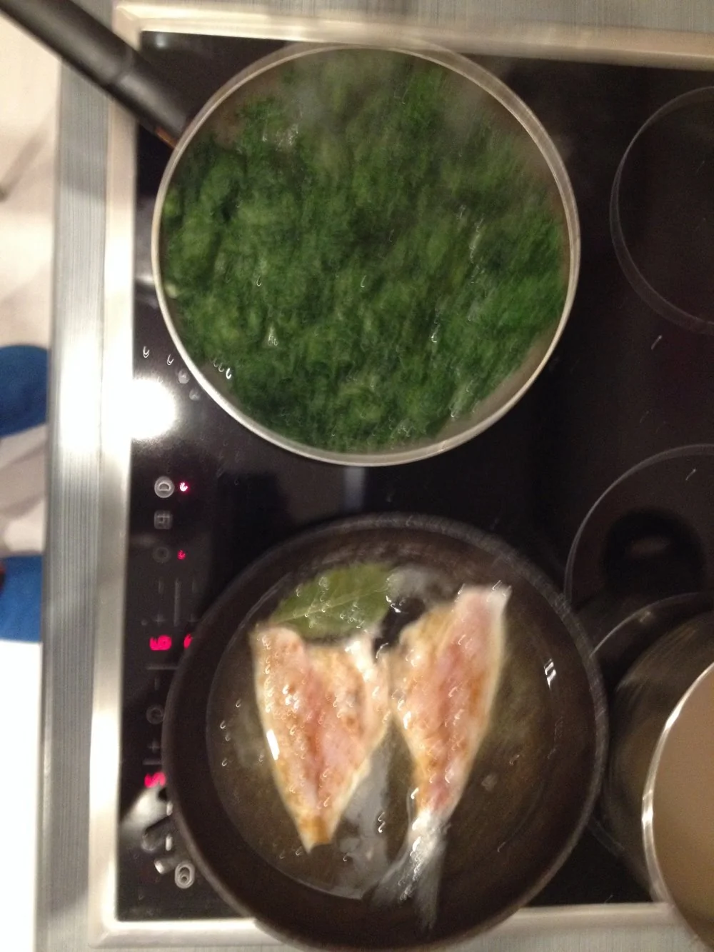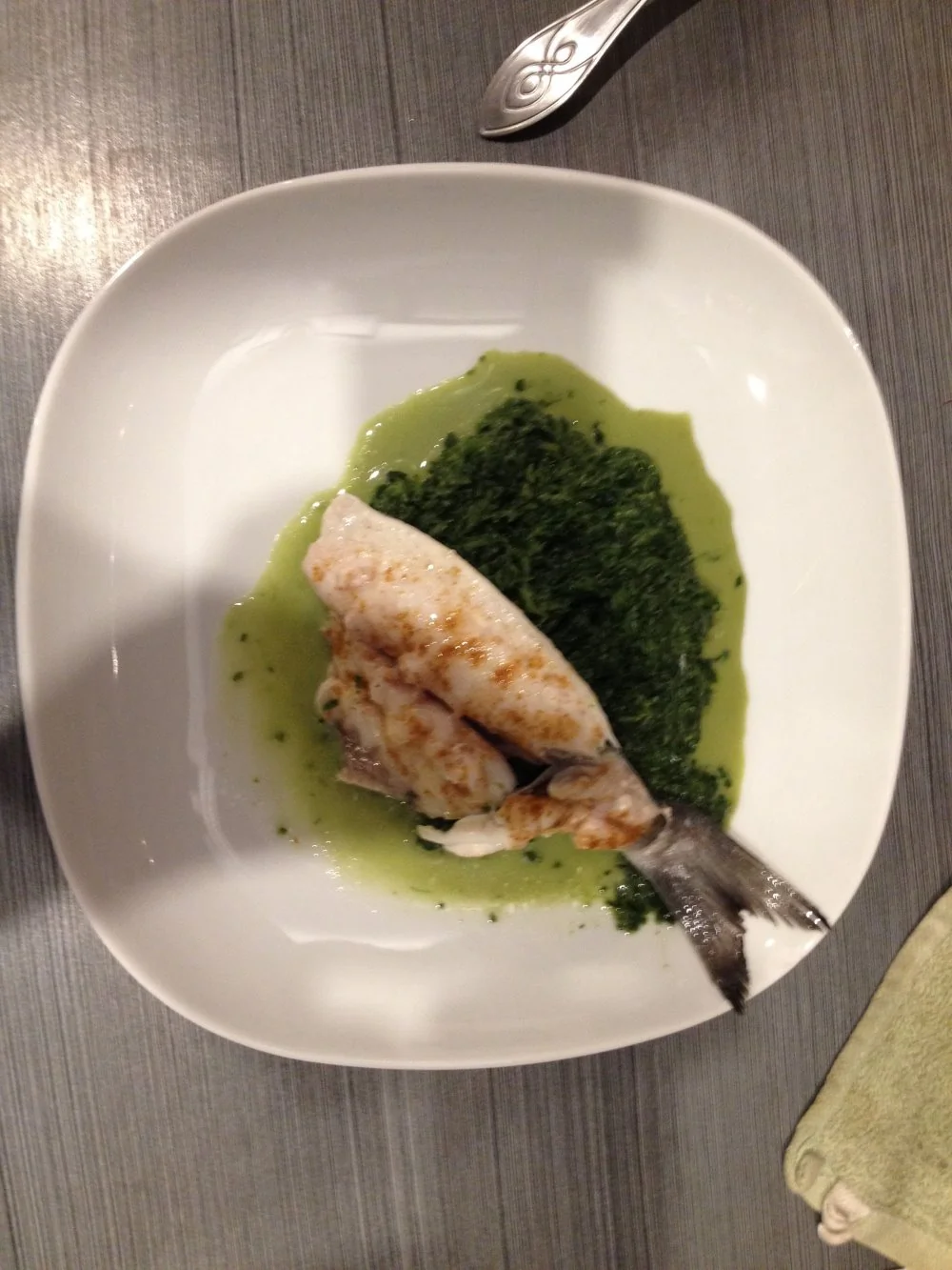 Дорада, припущенная в вине, на подушке из шпината со сливками