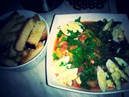 Помидоры Молодые кабачки Сладкий перец Лук репчатый Чеснок Зеленый стручковый перец Зелень Яйцо куриное Оливковое масло Основные блюда Испанская кухня Горячие закуски