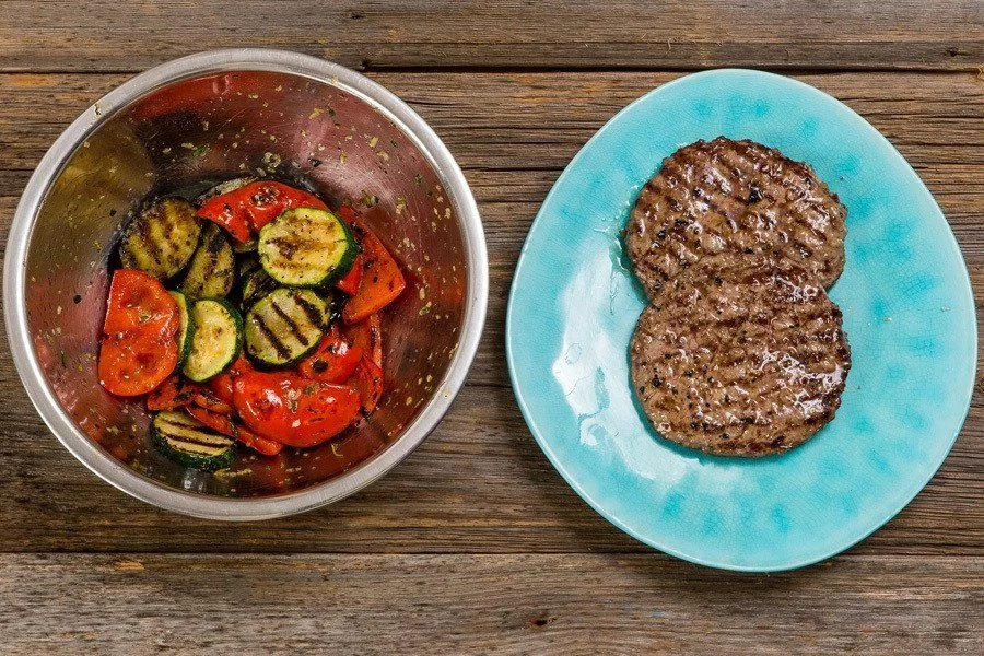 ШАГ 5 Обжарьте баклажаны и цукини на раскаленной сковороде гриль по 1,5 минуты с каждой стороны, болгарский перец обжарьте по 2 минуты с каждой стороны; обжарьте котлеты на раскаленной сковороде гриль по 1 минуте с каждой стороны обильно поперчив при переворачивании.