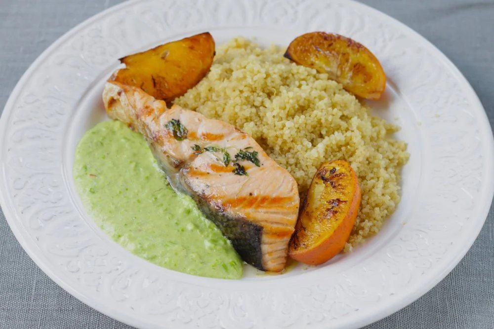 Лосось с киноа, апельсинами и пюре из зеленого горошка