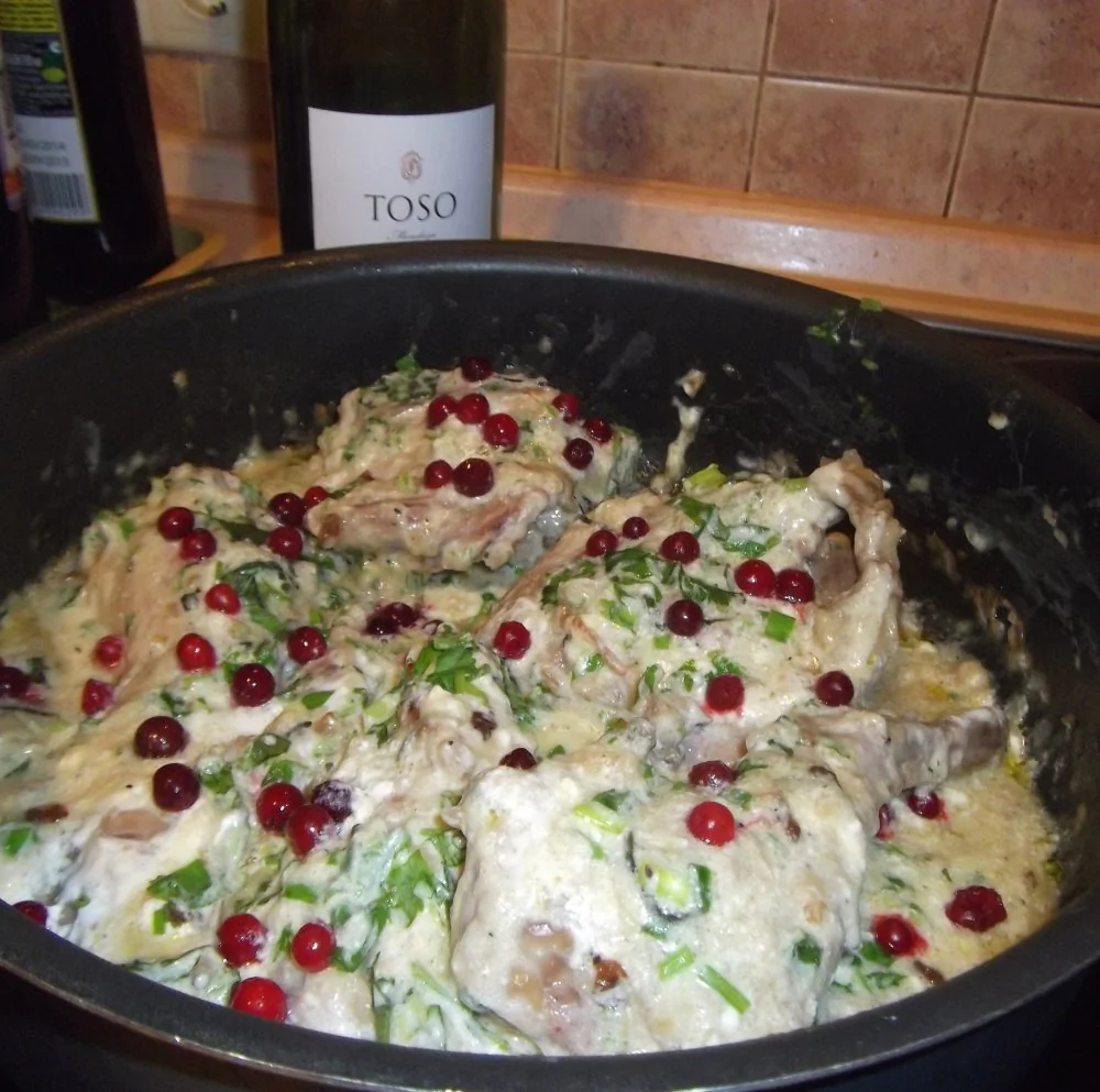 Тушеный кролик в винно-лимонном маринаде с брусникой