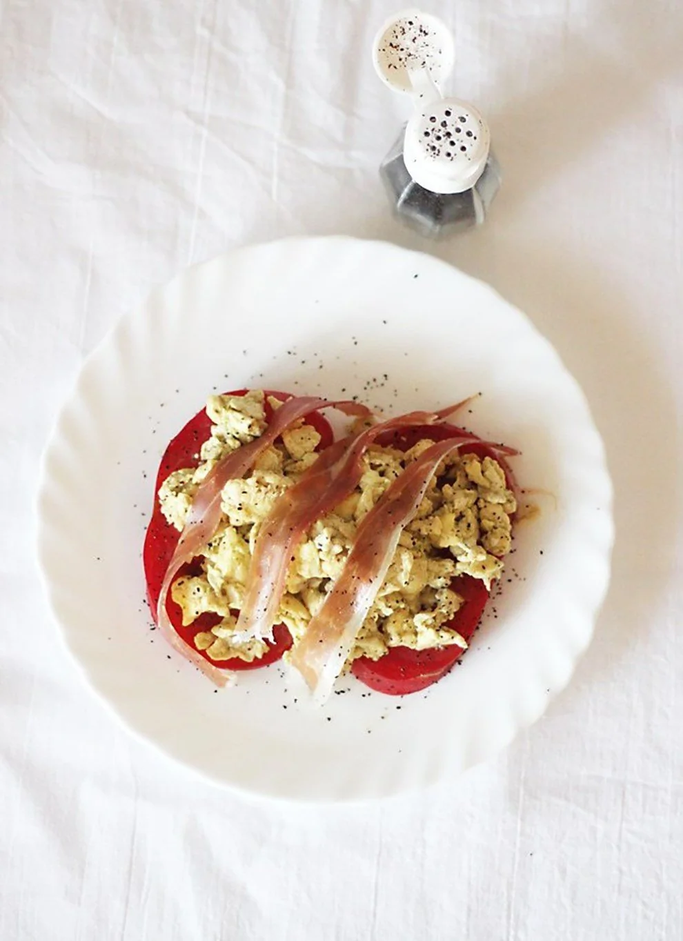 ШАГ 3 Помидор нарезать ломтиками, выложить на тарелку. На него выложить яичницу и украсить ломтиками прошутто. Приправить свежемолотым перцем.