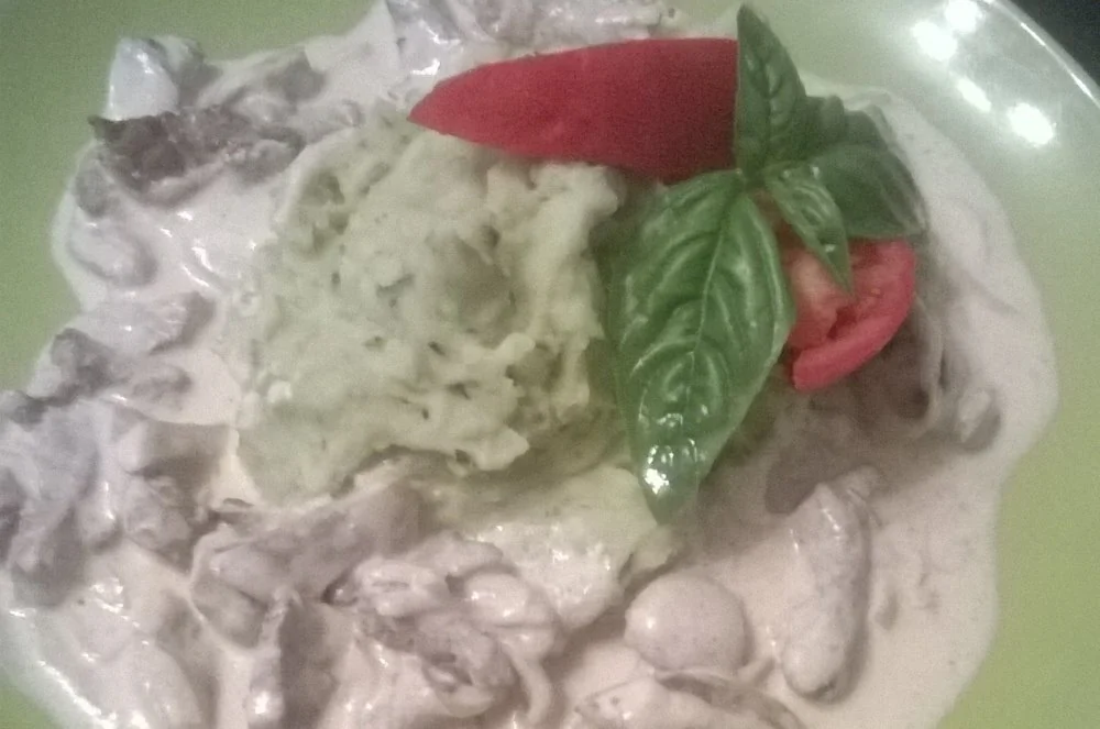 ШАГ 5 В середину тарелки выложить пюре, вокруг — бефстроганов.