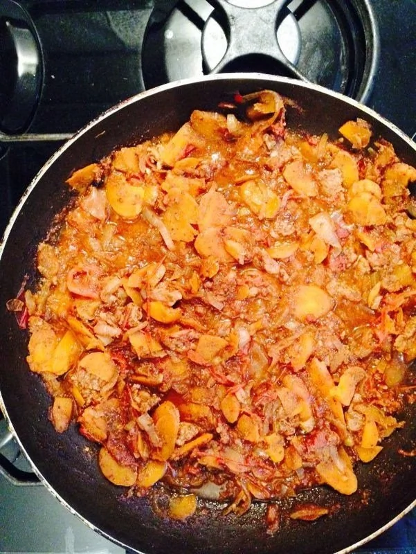 ШАГ 1 Мясо режем мелкими кусочками. Кладем на сковороду с небольшим количеством масла, накрываем крышкой. Мясо выделяет влагу и тушится минут 10–15. Солим, затем разводим аджику с водой и поливам мясо. Добавляем приправу по вкусу.