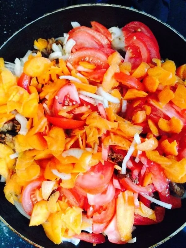 ШАГ 2 Режем крупно помидоры (ломтиками), лук полукольцами и трем морковь на крупной терке (либо режем кубиками). Первым к мясу добавляется лук, перемешивается. Через пару минут-помидоры и морковь. Добавляем еще немного воды и накрываем крышкой.