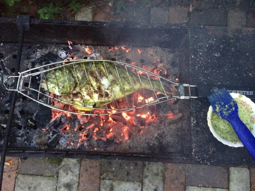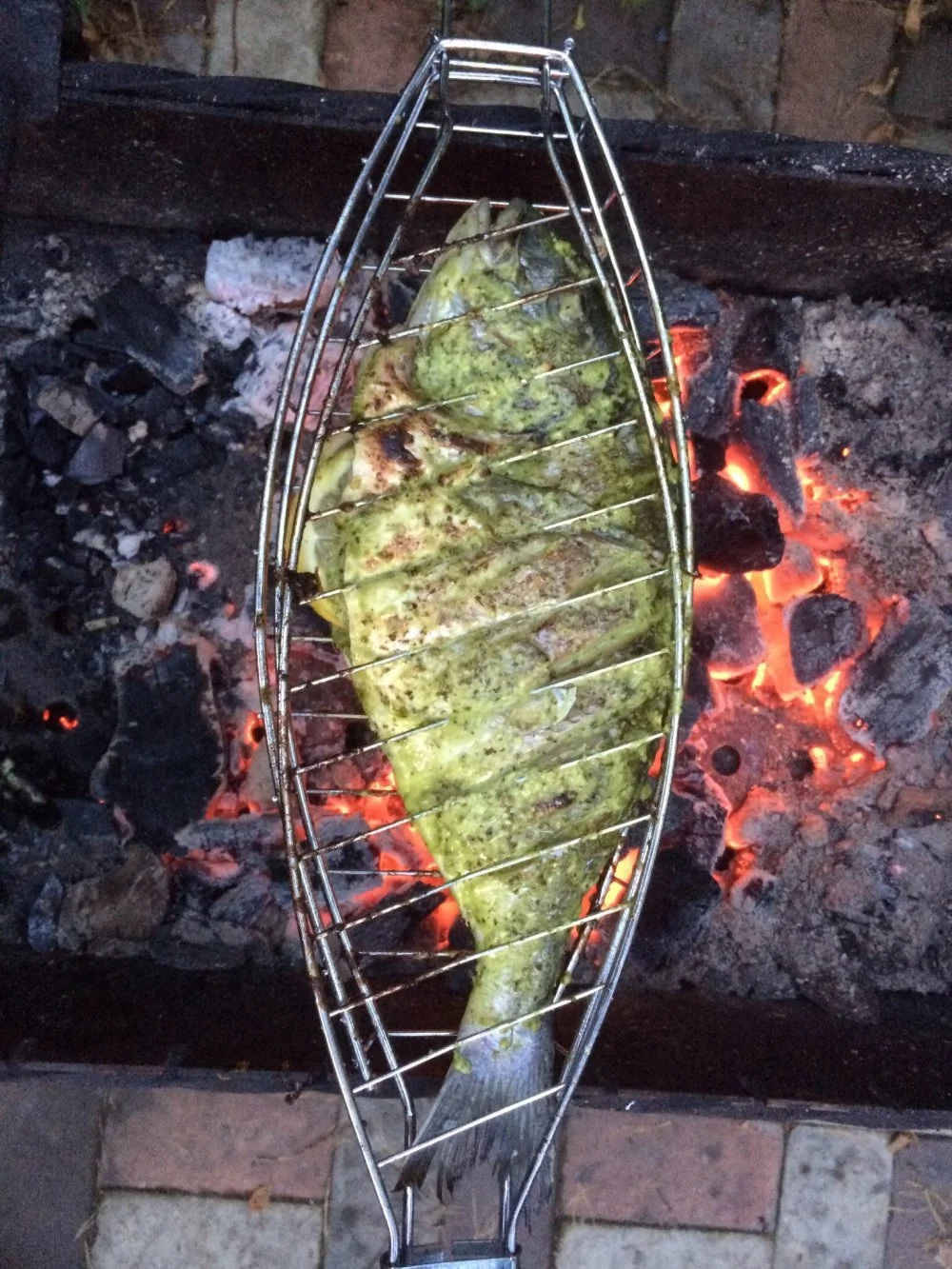ШАГ 5 Обжаривать рыбу на белых углях до готовности время от времени смазывая кулинарной кистью маринадом.