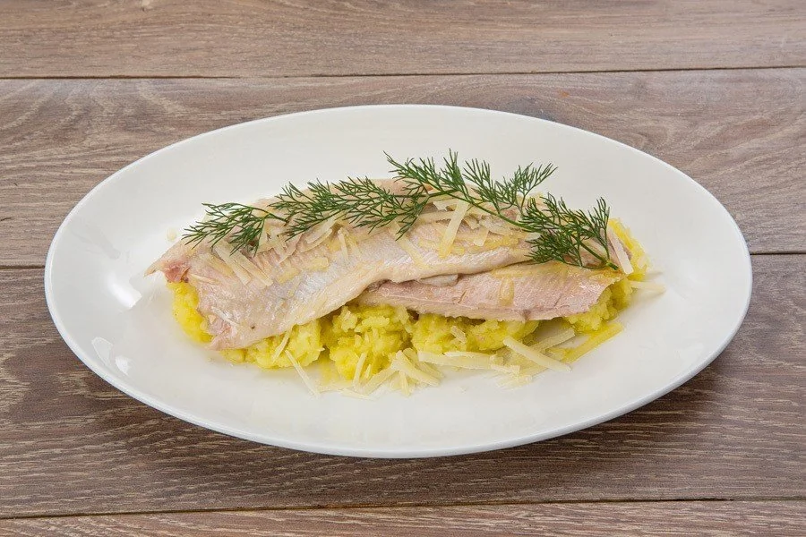 ШАГ 7 Выложите филе рыбы и картофель на тарелку, картофель полейте 1 чайной ложкой оливкового масла и посыпьте пармезаном, украсьте рыбу укропом и подавайте.