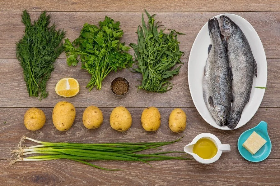 Ингредиенты для приготовления Форель, запеченная в бумаге, с картофелем: