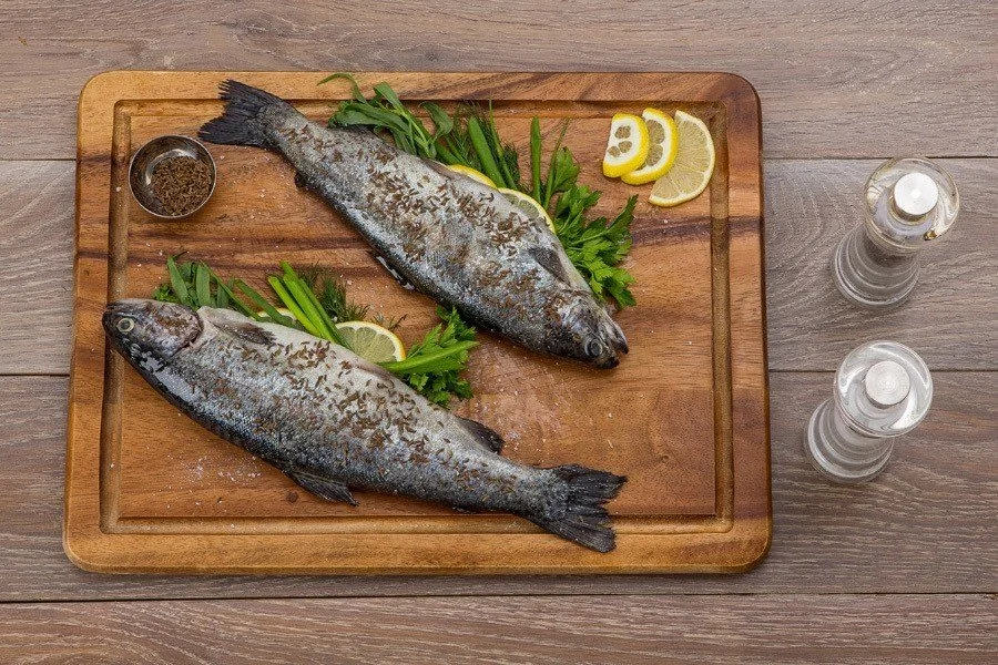 ШАГ 1 Лимон нарежьте дольками шириной 5 мм, внутрь форели положите 1/3 зелени, нарезанный лимон, далее поперчите, посолите и посыпьте рыбу тмином снаружи.