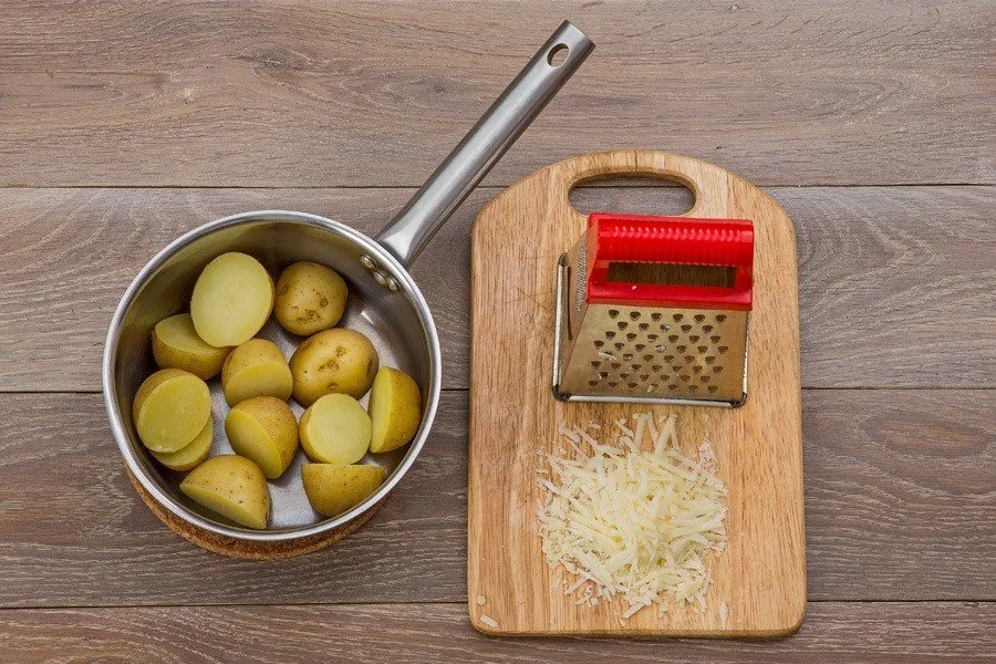 ШАГ 2 Разрежьте картофель пополам и отварите в мундире, на среднем огне в течение 15-ти минут, натрите пармезан на крупной терке.