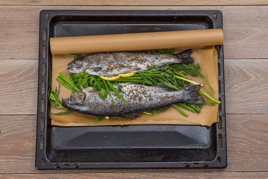 ШАГ 3 Сложите бумагу в несколько слоев, оставьте длинный край, выложите половину оставшейся зелени, сверху на траву выложите рыбу.